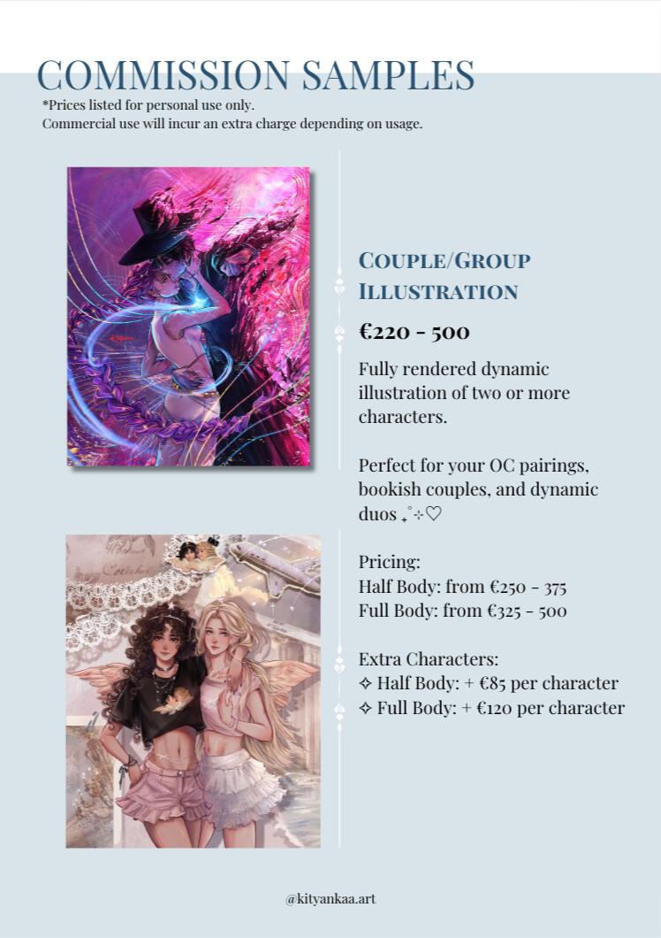 β‘ Couple/Group: from β¬220Pricing will vary depending on the complexity of the request. Intricate outfits, accessories and props, as well as complex compositions, backgrounds or lighting effects will be priced toward the higher end of the range. Conversely, requests for simpler designs and compositions will remain close to base price.*prices for personal use only, for commercial enquiries please see Terms of Service.